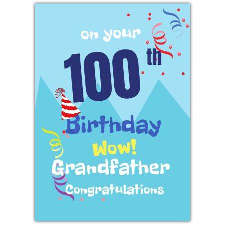 This cheerful and vibrant card is perfect for honouring your grandfather’s incredible 100th birthday. With its bright blue background, playful party hat, and colourful confetti and streamers, this card brings an uplifting and festive touch to a once-in-a-lifetime occasion.