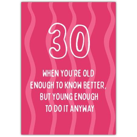 This vibrant pink greeting card features a witty message perfect for marking the milestone 30th birthday. With its cheeky phrase, "30 - When you're old enough to know better, but young enough to do it anyway," it perfectly captures the balance of wisdom and youthful spirit that this age represents.