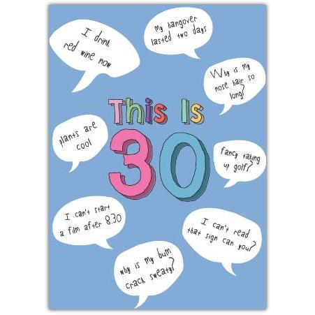 Mark the joyous occasion of a 30th birthday with this fun and playful greeting card, designed to bring smiles and laughter. Featuring colourful, bold numbers “30” surrounded by quirky speech bubbles with funny musings about turning 30—like “I drink red wine now” and “My hangover lasted two days”—this card perfectly captures the light-hearted side of reaching this milestone.