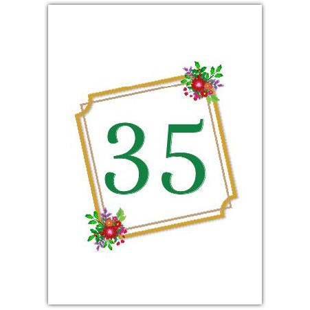This beautifully designed greeting card is perfect for commemorating a 35th birthday, anniversary, or any meaningful event marked by the number 35. Featuring a stylish green "35" framed with a sleek gold border and adorned with delicate floral accents, this card strikes the perfect balance between simplicity and sophistication.