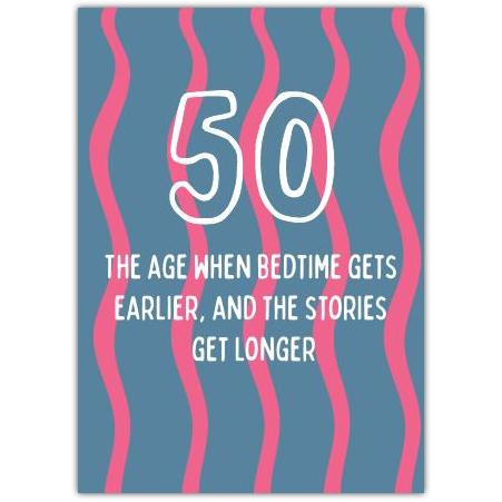 This cheerful greeting card is the perfect way to mark a special 50th birthday. Featuring a playful design with bold, wavy pink lines against a blue background, the card reads: