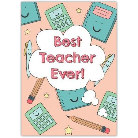 Show your appreciation with this charming "Best Teacher Ever!" greeting card. Featuring a playful and colourful design filled with smiling school essentials like calculators, notebooks, pencils, and pens, this card is perfect to celebrate the special teacher in your life.