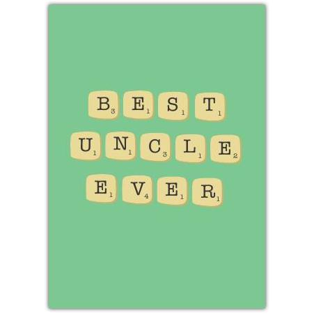 Show your appreciation for that special uncle with this charming and playful greeting card featuring the heartfelt message “Best Uncle Ever” spelled out using letter tiles reminiscent of a classic word game. The simple green background highlights the clever design, making this card a delightful way to express your gratitude and affection.