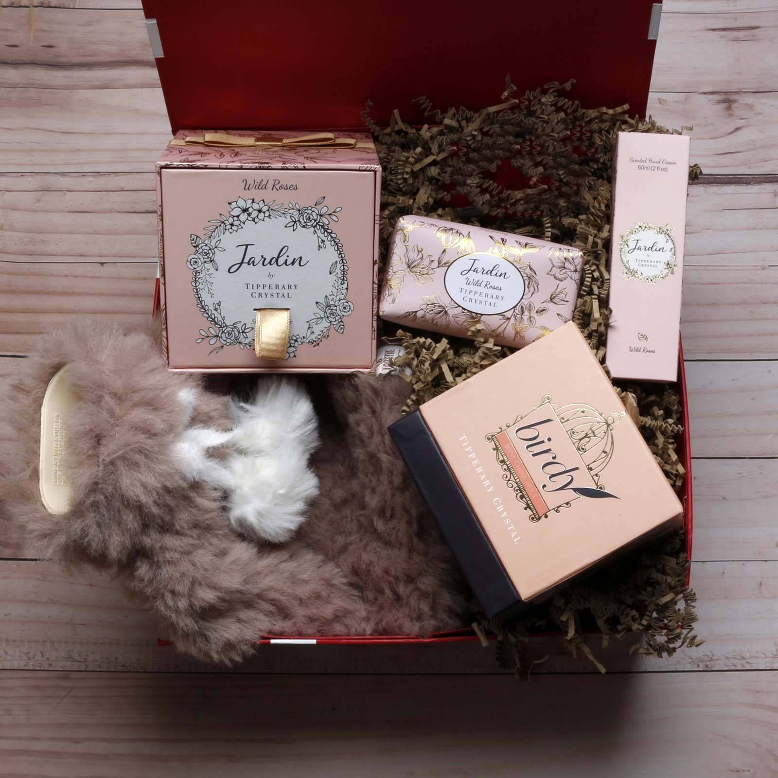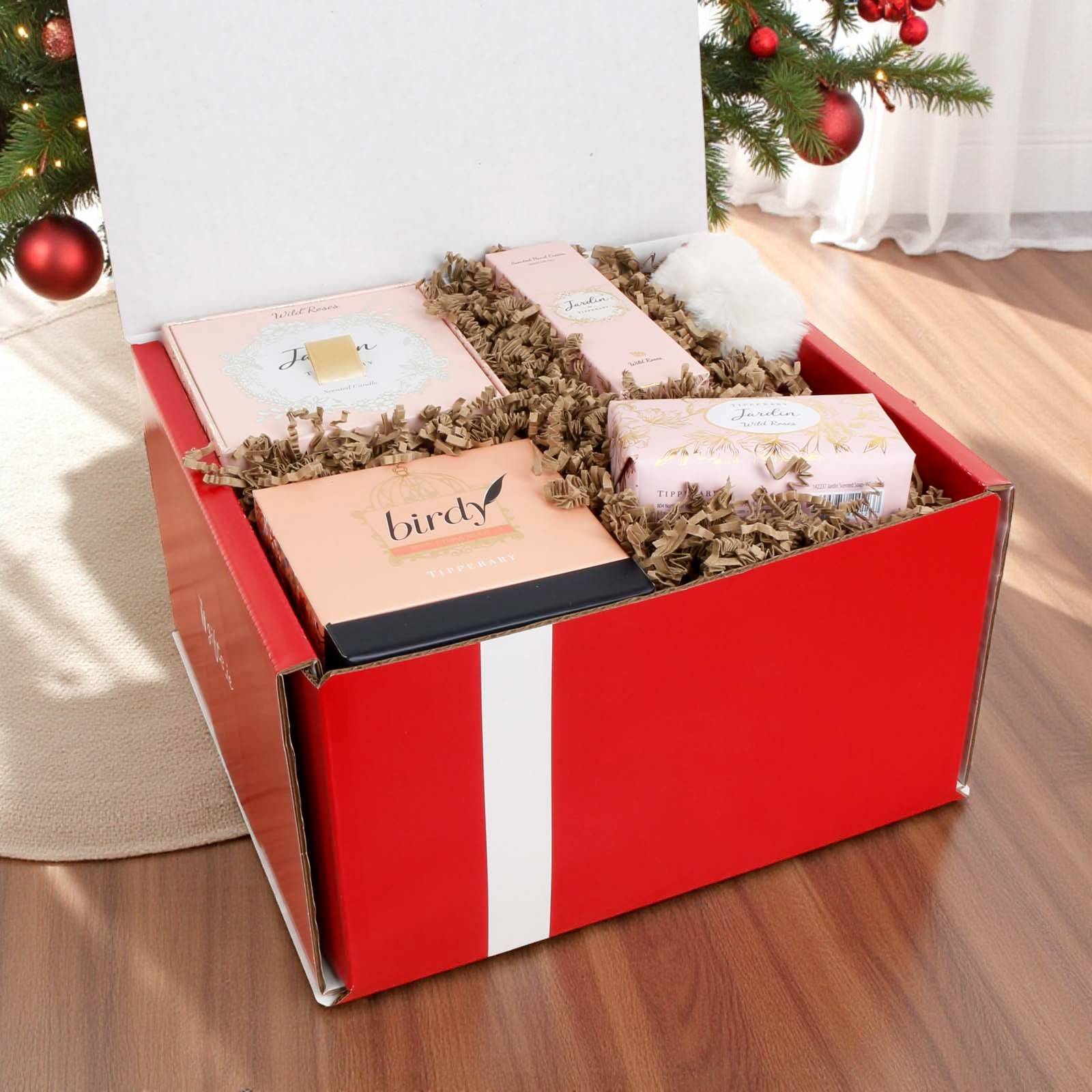 The hamper is presented in a Brown reusable gift box. The gift box is packed inside a separate shipping box for secure transport.