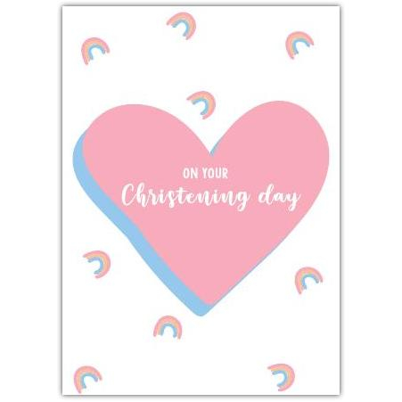This charming card features a large pink heart with a subtle blue shadow, surrounded by sweet pastel rainbows, making it a perfect choice to mark the joyous occasion of a christening. The gentle colour palette and simple yet heartfelt design evoke warmth and love, ideal for welcoming a new life into faith and family.