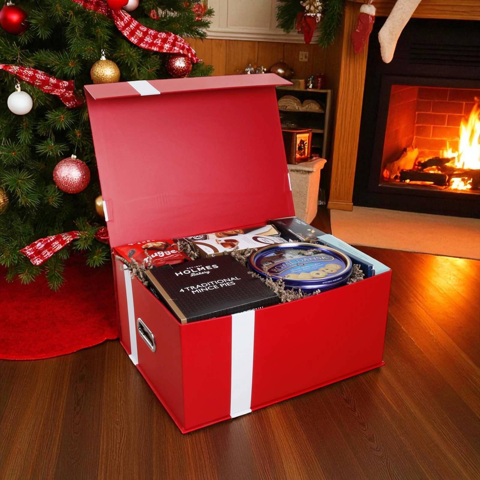 The hamper is presented in our new luxury red gift box with satin bow. Stylish and reusable, the gift box is packed inside a separate shipping box for secure transport.