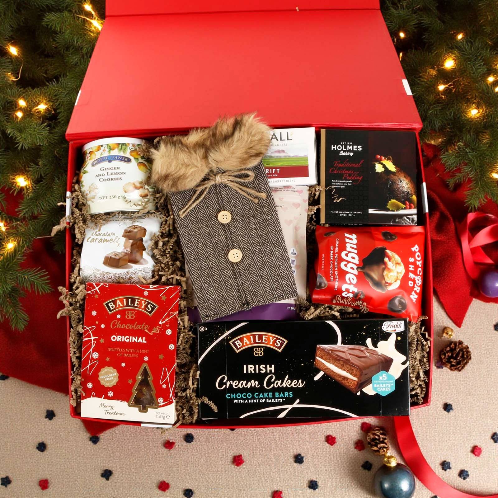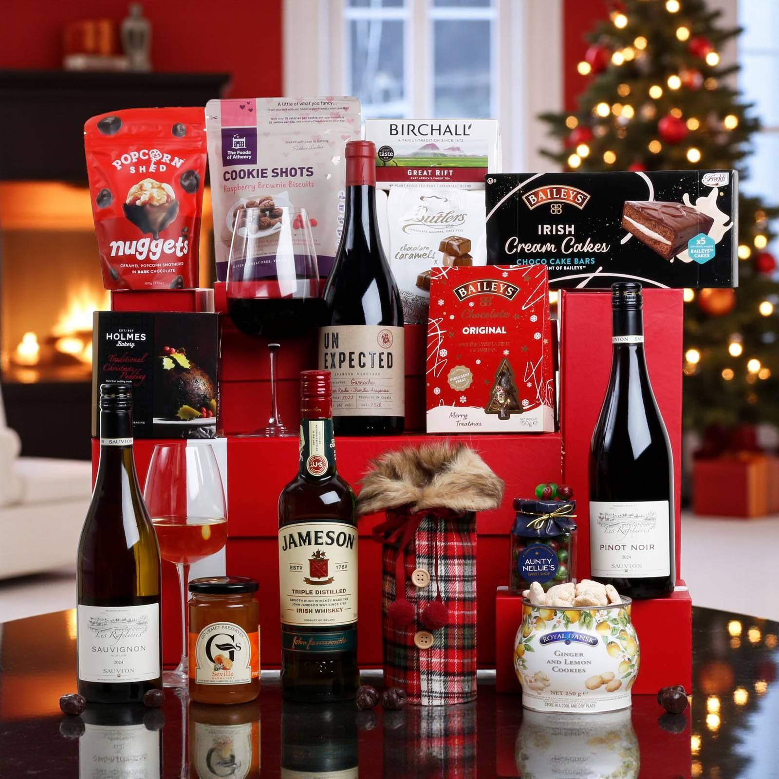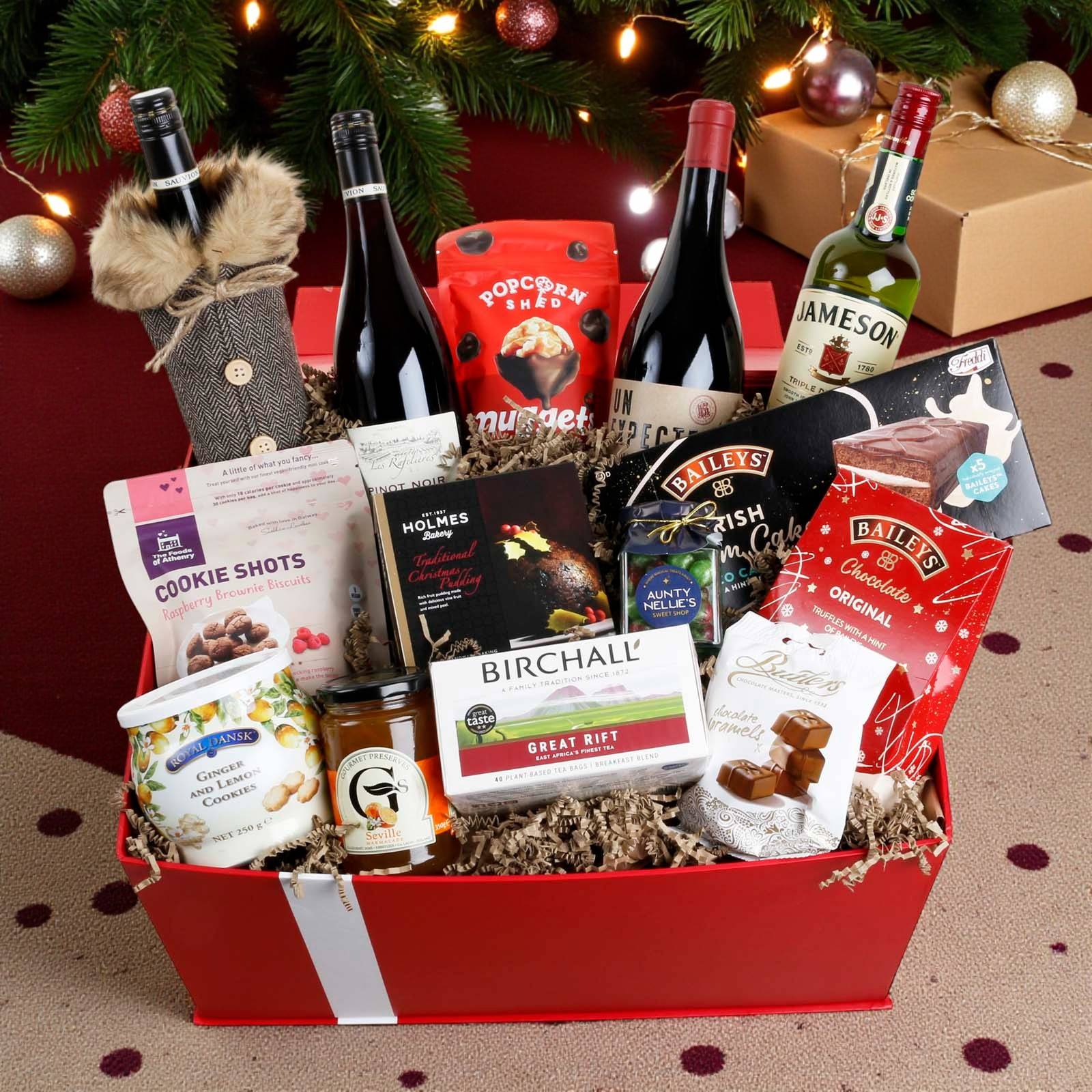 The hamper is presented in our new luxury red gift box with satin bow. Stylish and reusable, the gift box is packed inside a separate shipping box for secure transport.