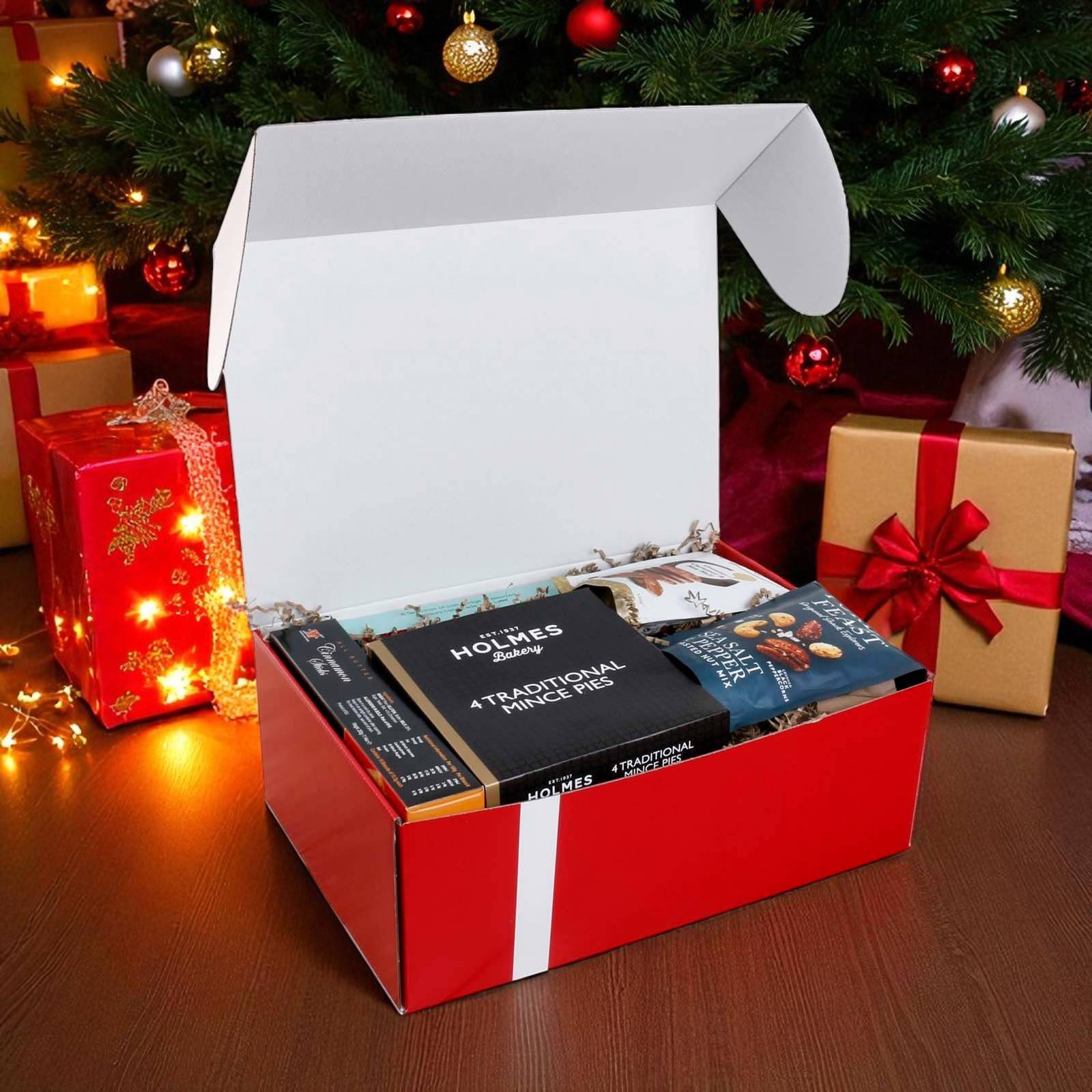 The hamper is presented in red gift box. The gift box is packed inside a separate shipping box for secure transport.