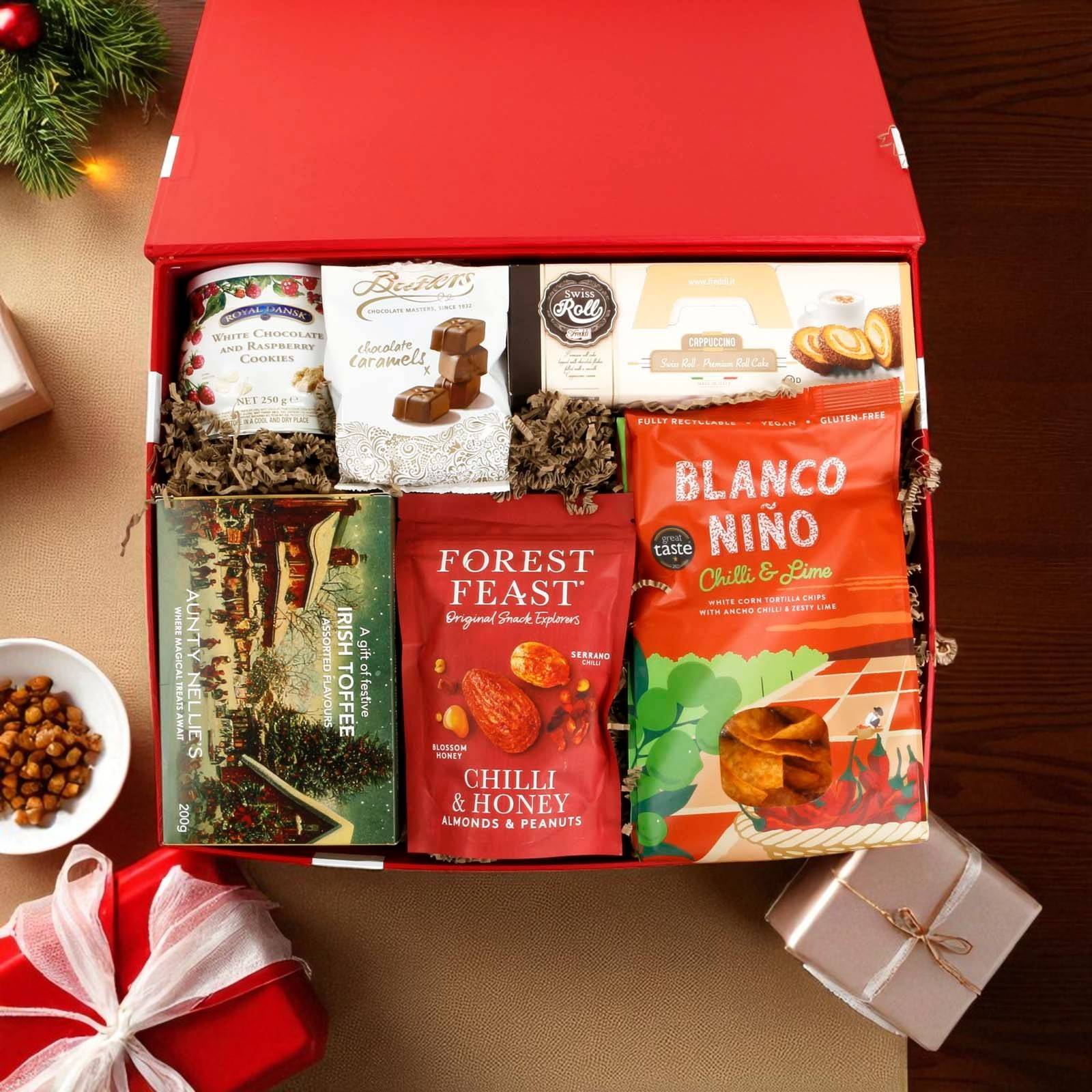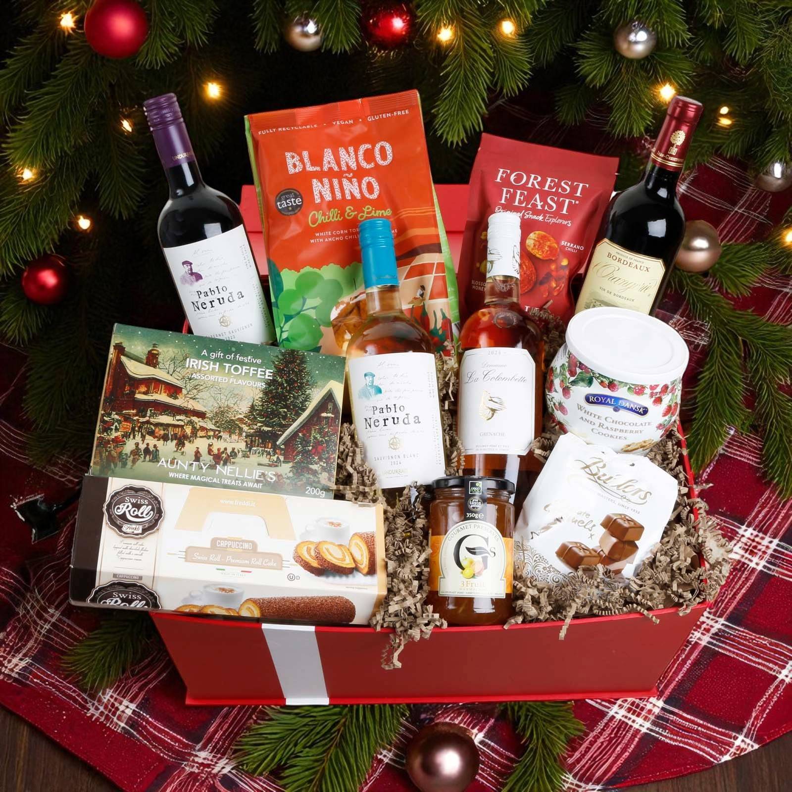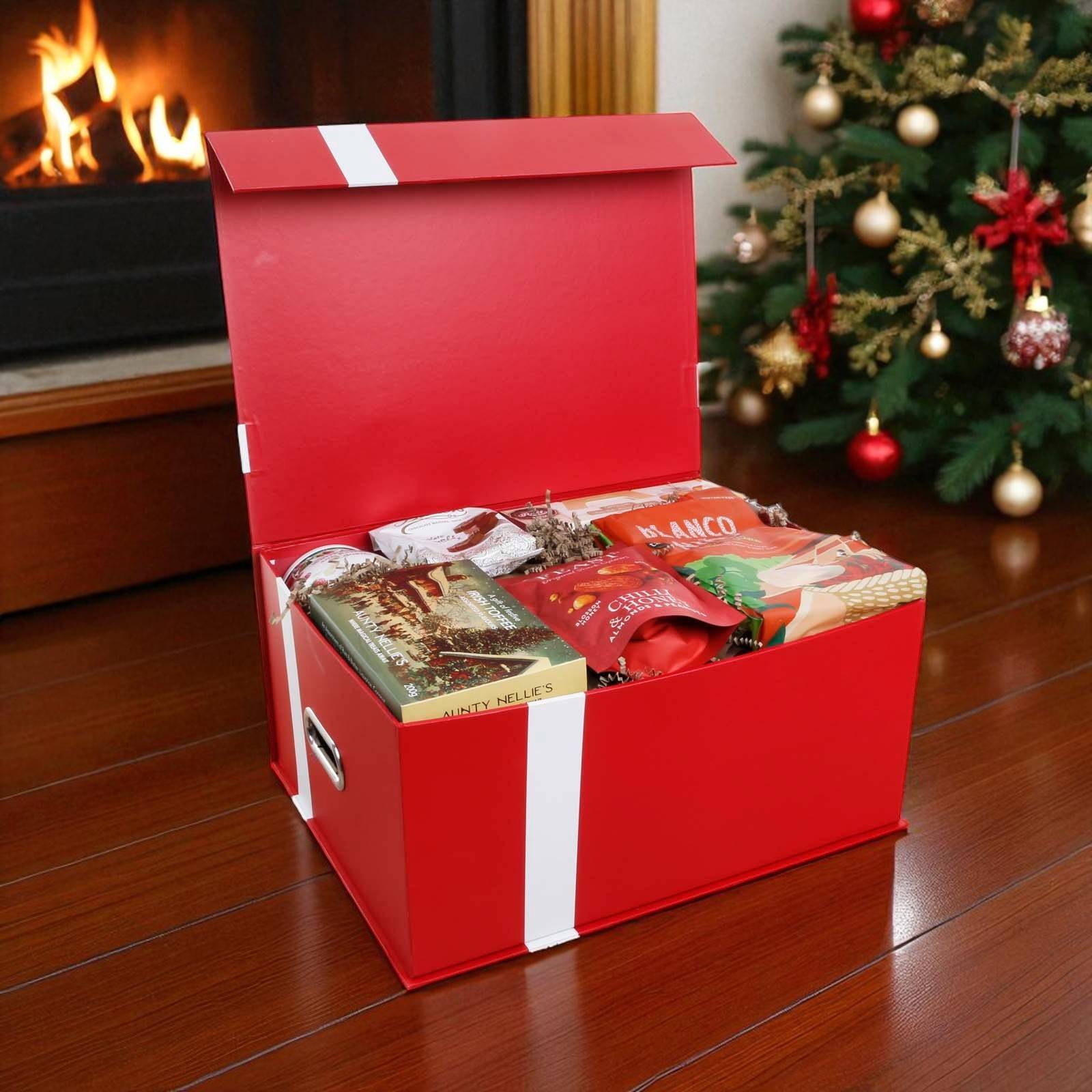 The hamper is presented in our new luxury red gift box with satin bow. Stylish and reusable, the gift box is packed inside a separate shipping box for secure transport.