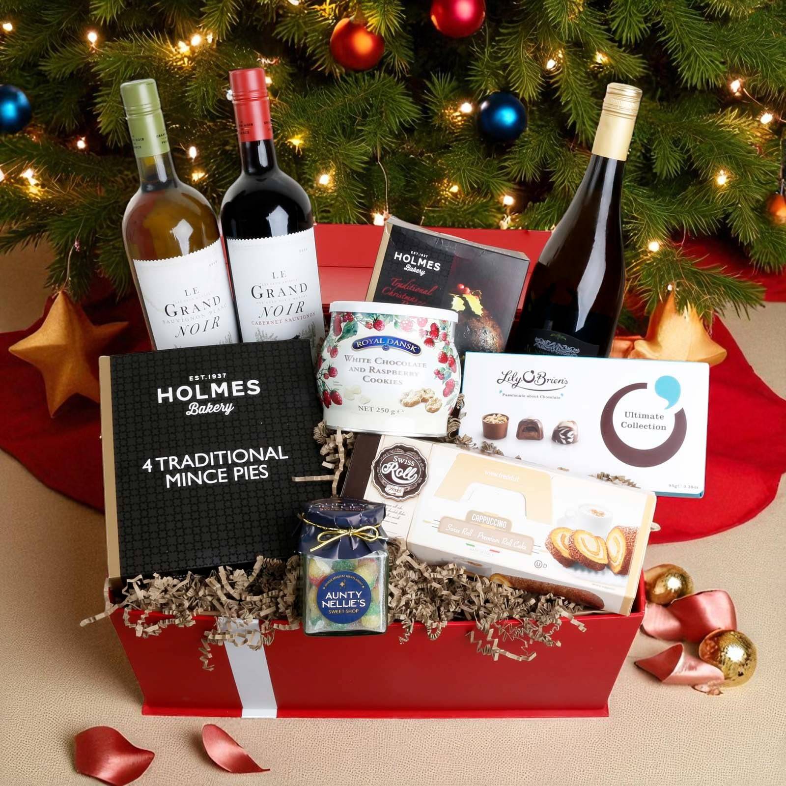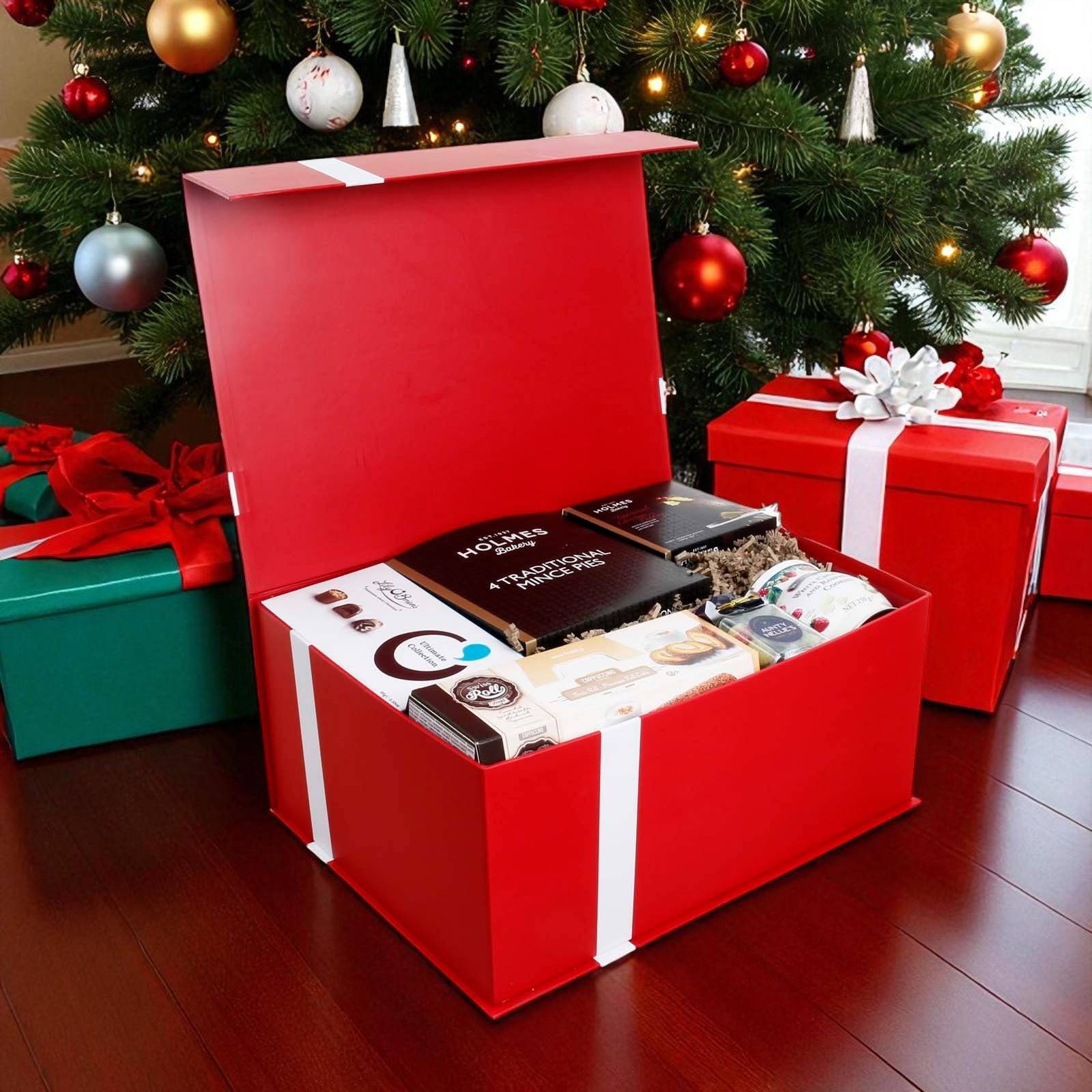 The hamper is presented in our new luxury red gift box with satin bow. Stylish and reusable, the gift box is packed inside a separate shipping box for secure transport.