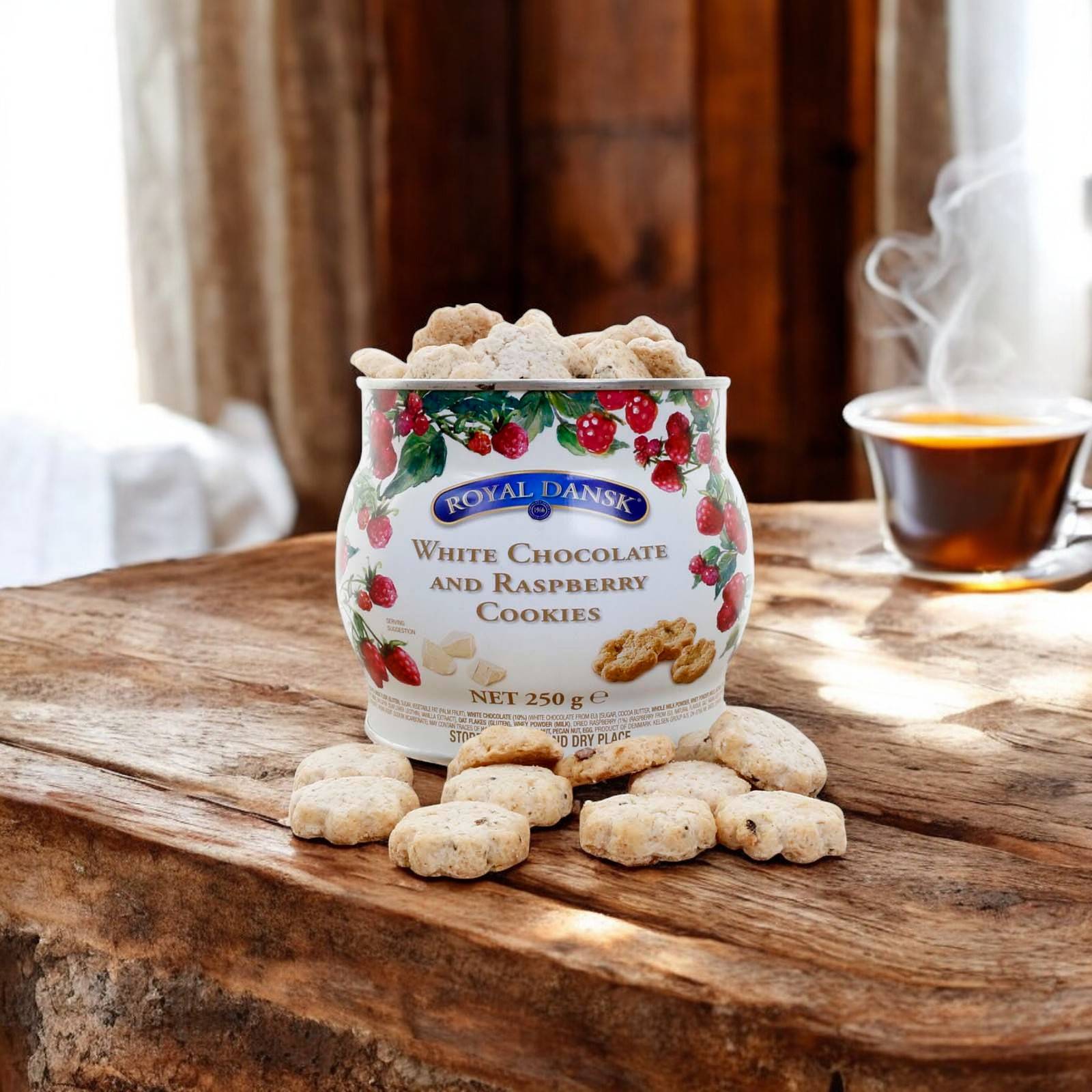 • White Chocolate & Raspberry Cookies in Globe Tin 250g