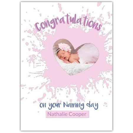 Celebrate the arrival of a precious new baby girl with this charming Congratulations New Baby Girl Love Heart Frame Card. Featuring a delicate pink splash design and a heart-shaped photo frame, this card adds a personal touch by allowing you to upload a special photo of the little one. The playful "Congratulations" message is perfectly paired with the sweet sentiment "on your Naming day," making it an ideal keepsake for this unforgettable occasion.