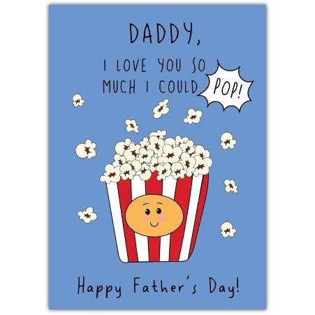 This charming Father's Day card is a delightful way to show your dad just how much he means to you. Featuring a cute, smiling popcorn tub bursting with fluffy popcorn and the playful message, "Daddy, I love you so much I could POP!", it’s perfect for bringing a smile to his face.
