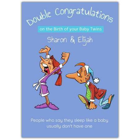 Celebrate the wonderful arrival of baby twins with this charming and humorous greeting card. Featuring a playful illustration of tired new parents, this card perfectly captures the joyous yet sleepless early days of parenthood.