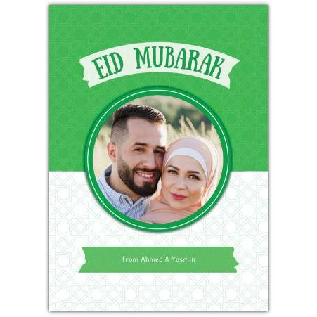 Send heartfelt wishes this Eid with our Eid Mubarak Green Photo Upload Greeting Card, elegantly designed to blend tradition and modern personal touch. Featuring a striking green and white colour scheme adorned with subtle geometric patterns, this card perfectly captures the spirit of celebration and gratitude.
