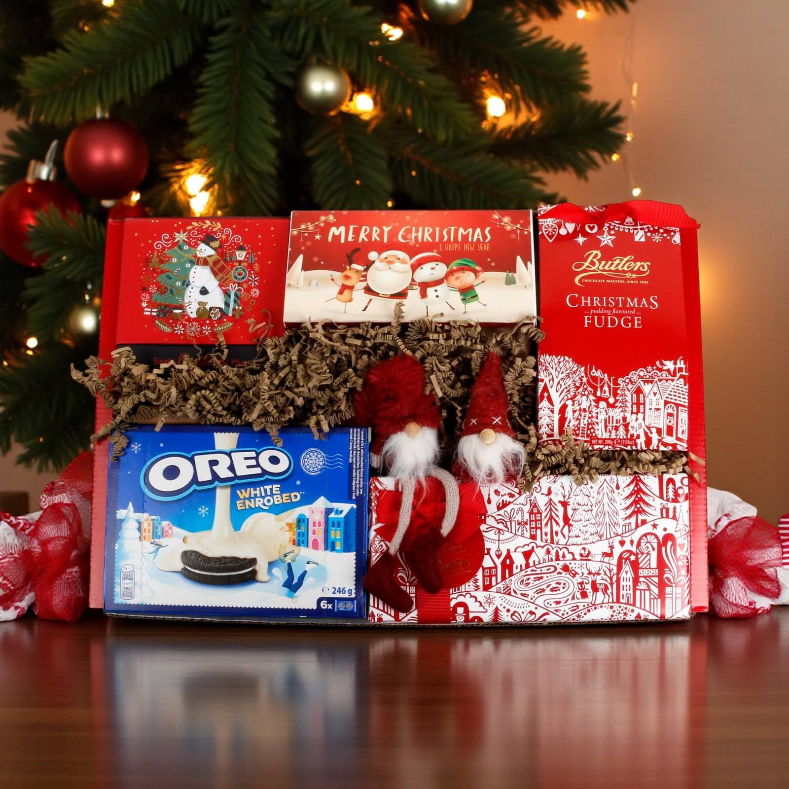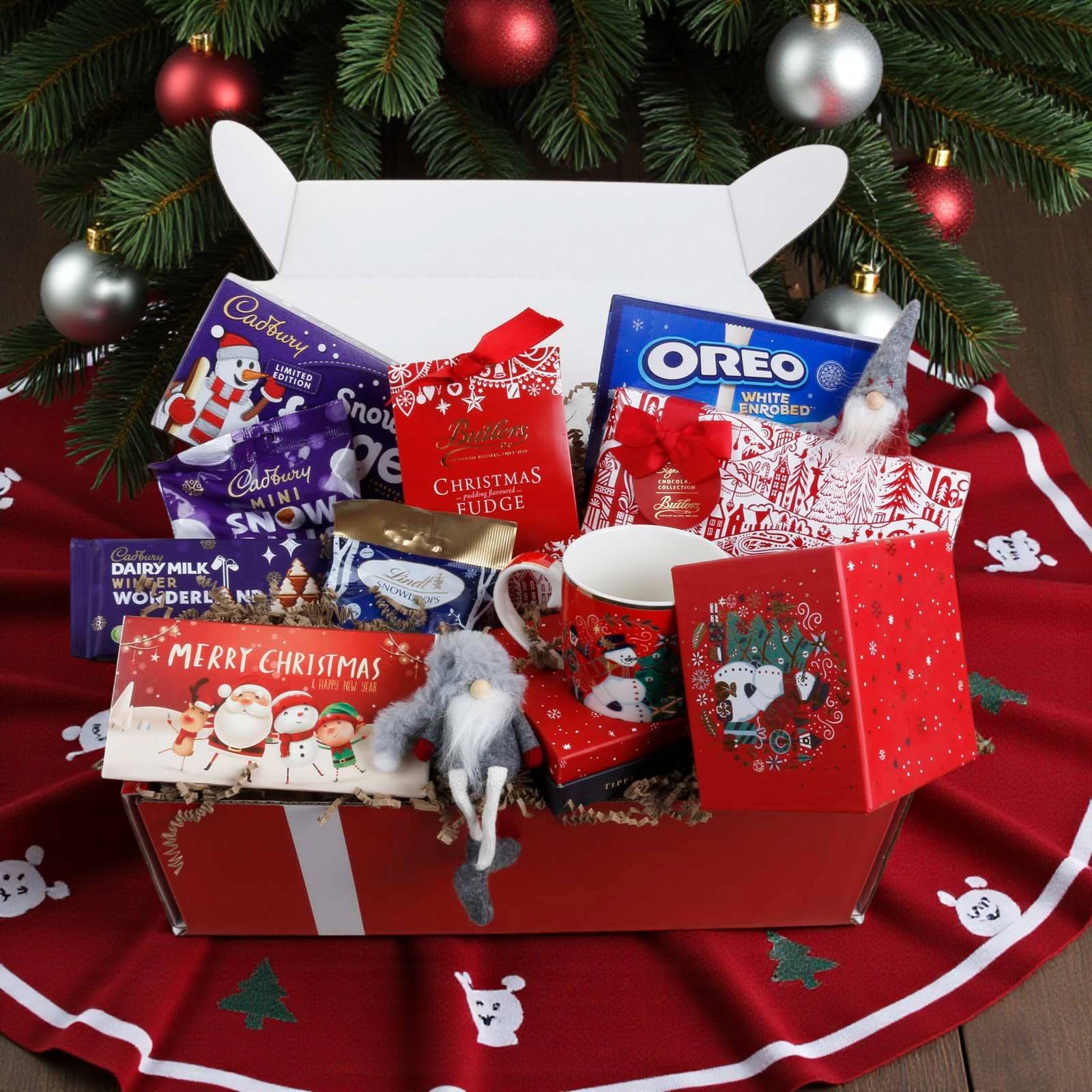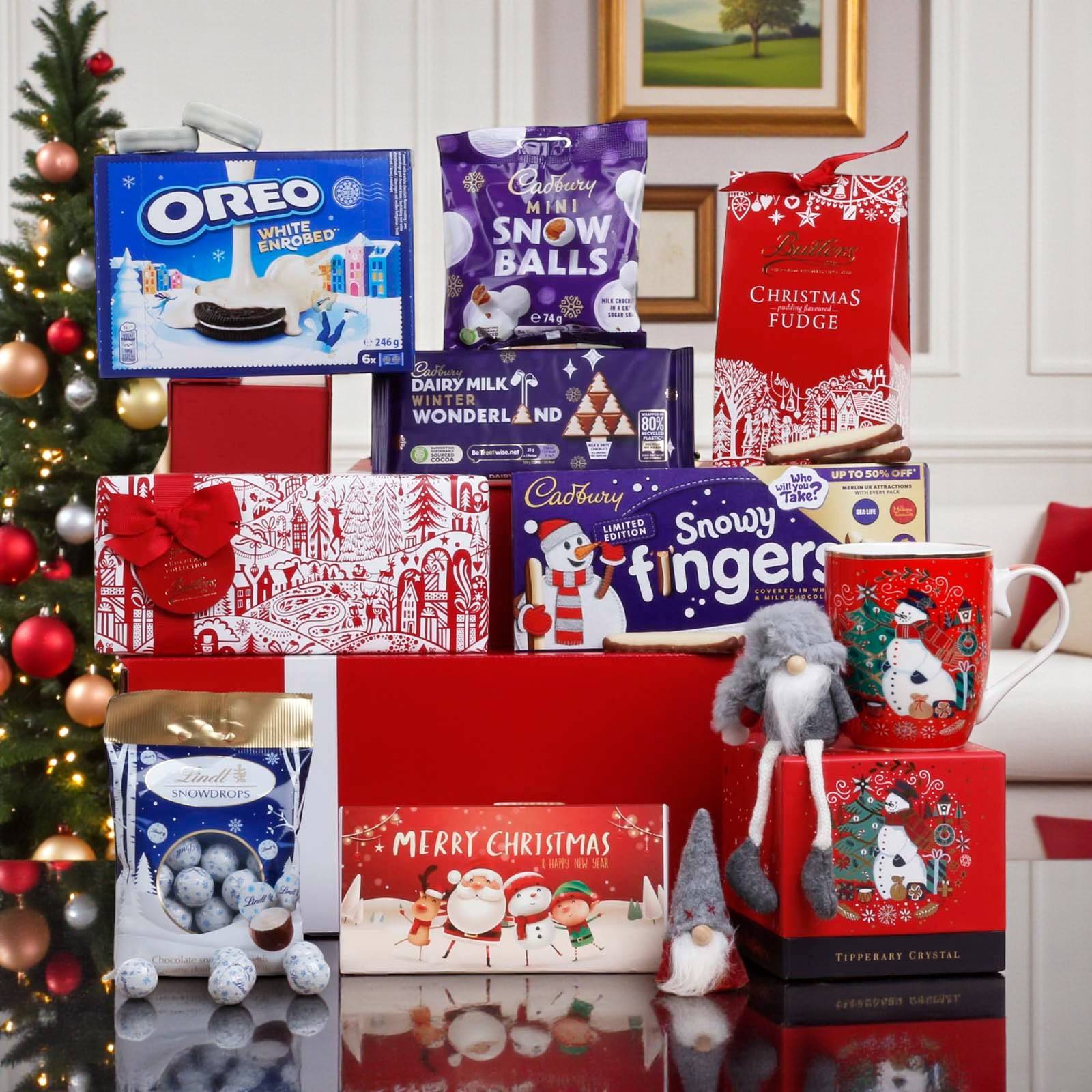 - Festive Variety: A delicious mix of chocolates, fudge, biscuits and a festive mug, presented with charming Christmas decorations.