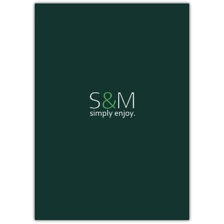 Inject some cheeky humour and a playful twist into your Valentine’s Day this year with this bold and witty greeting card. Featuring a sleek dark green background with the clever wording "S&M simply enjoy.", this card is perfect for couples who share a naughty sense of humour and want to celebrate their love with a bit of spice and fun.