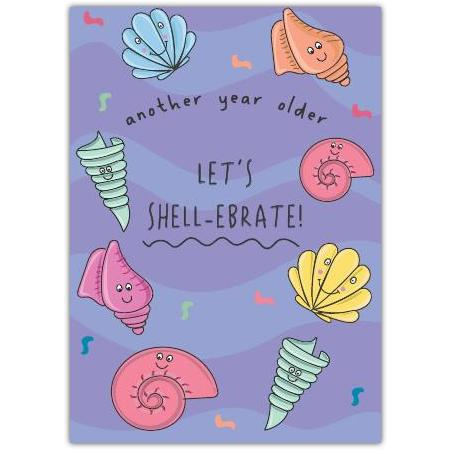 This delightful greeting card features a charming underwater theme with colourful, smiling shells and sea creatures set against a soothing wave-patterned background. The playful pun, "another year older, LET’S SHELL-EBRATE!", adds a lighthearted and joyful touch that's perfect for marking a birthday or any special milestone.