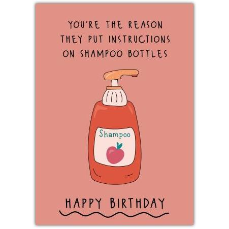 - Design: Featuring a quirky illustration of a shampoo bottle and the witty message, "You're the reason they put instructions on shampoo bottles," this card is perfect for anyone with a great sense of humour.