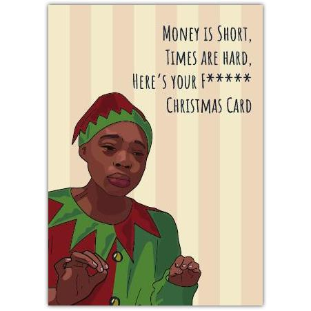 Featuring a playful illustration of an elf and witty text that reads, “Money is short, times are hard, here’s your [*****] Christmas card,” this design captures the very relatable challenges of the holiday season with a dash of humour. It’s perfect for anyone who appreciates a little sarcasm and honesty alongside their festive cheer.