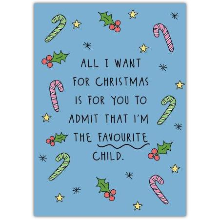 This playful Christmas card is perfect for bringing a smile to the face of a loved one, especially your parents or guardians. The cheeky message, "All I want for Christmas is for you to admit that I'm the favourite child," adds a fun and lighthearted twist to your holiday greetings.