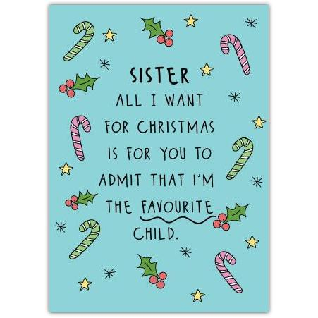 Celebrate Christmas with a cheeky twist! This fun and playful greeting card is perfect for sharing a smile with your sister this festive season. Featuring a lighthearted message—"Sister all I want for Christmas is for you to admit that I'm the favourite child"—it’s sure to bring laughter and warmth to your holiday celebrations.
