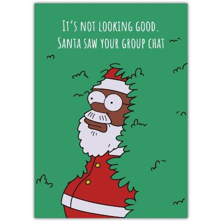 This cheeky card features a playful illustration of a Santa Claus caught mid-peek from behind some greenery, paired with the witty message: “It’s not looking good. Santa saw your group chat.” Perfect for sharing a light-hearted laugh with friends, family, or colleagues, it’s ideal for anyone who enjoys a bit of humour during the holidays.
