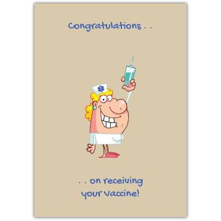 Celebrate a milestone with a touch of humour! This Congratulations on Receiving Your Vaccine card features a cheerful cartoon nurse holding a syringe, perfect for brightening someone's day as they receive their vaccine.
