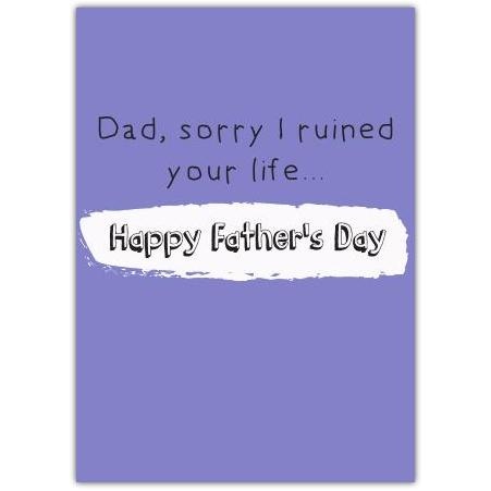 Inject a splash of cheeky humour into your Father's Day celebrations with this bold and playful greeting card. Featuring a striking purple background and a witty message that reads, "Dad, sorry I ruined your life... Happy Father's Day," this card is perfect for dads who appreciate a bit of dark humour and light-hearted fun.