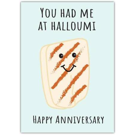 Celebrate your love with a tasty twist! This Anniversary Cheesy Halloumi Puntastic Greeting Card is perfect for couples who share a sense of humour and a love for fun puns. Featuring a charming grilled halloumi slice with a friendly smile and the witty caption, "You had me at halloumi", this card brings a lighthearted and affectionate touch to your anniversary wishes.