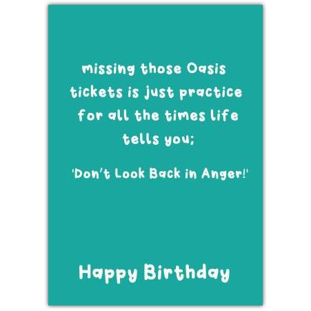 This humorous greeting card features a playful message referencing the iconic band Oasis, perfect for those who appreciate a bit of music nostalgia alongside their birthday wishes. With its clever text—"missing those Oasis tickets is just practice for all the times life tells you; 'Don't Look Back in Anger!'"—this card strikes a fun, light-hearted tone that’s ideal for friends, family, or colleagues who love a good laugh and great tunes.