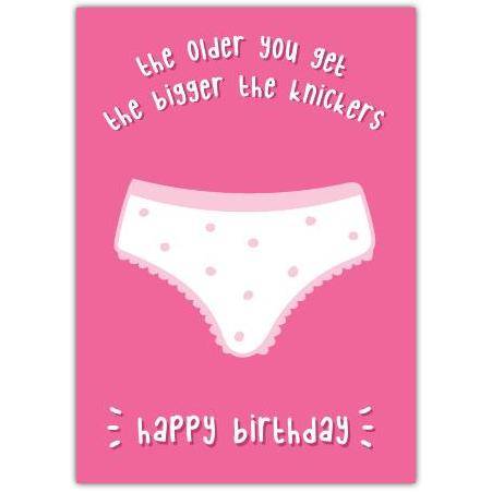 Celebrate laughter and ageing with a cheeky twist! This Happy Birthday Bigger Knickers greeting card is perfect for those who love a fun, light-hearted joke on their special day. Featuring a playful illustration of polka-dotted knickers against a bright pink background, this card carries the humorous message: "the older you get, the bigger the knickers."