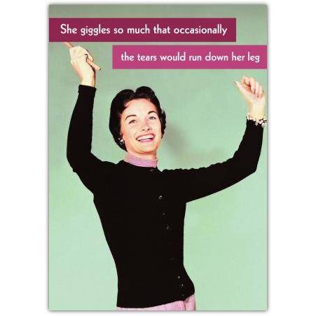 This charming greeting card captures the infectious joy of laughter with a delightful vintage-inspired design. Featuring an upbeat message, "She giggles so much that occasionally the tears would run down her leg," it’s perfect for anyone who loves to smile and find humour in everyday moments.