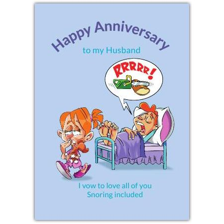 Share laughter and love with this delightful anniversary card—because a happy marriage embraces every little habit, even snoring!