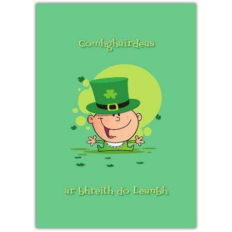 This playful greeting card showcases a joyful leprechaun character dressed in classic green, complete with a shamrock-adorned hat. The cheerful design is set against a vibrant green background, radiating the warmth and charm of Irish heritage. Featuring the Gaelic greeting "Comhghairdeas ar bhreith do Leanbh", it brings a unique and heartfelt touch to your message.