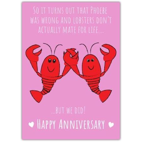 Celebrate your special day with a smile – this Anniversary Lobster Friends Funny Greeting Card is the perfect way to share laughter and love with your partner. Featuring two cheerful, red lobsters holding claws against a soft pink background, the card playfully references the popular idea that lobsters mate for life – with a cheeky twist that highlights your unique, enduring bond.
