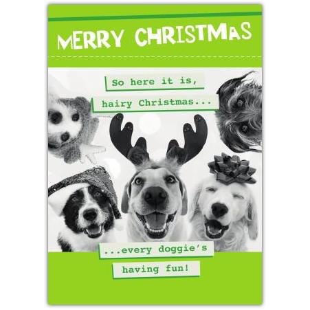 This charming card shows a variety of happy dogs, some wearing festive accessories like a Santa hat, reindeer antlers, and a gift bow, capturing the joyful spirit of Christmas with a humorous twist. The playful wording, "So here it is, hairy Christmas... every doggie's having fun!" adds a lighthearted and warm touch, perfect for animal lovers and anyone who enjoys a little festive fun.