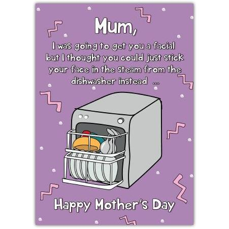 Celebrate Mum this Mother's Day with a card that's as unique and humorous as she is! Featuring a playful illustration of a dishwasher and a cheeky message, this card offers a lighthearted twist on the classic pampering theme. Instead of a traditional facial, it suggests a laugh-out-loud alternative that will bring a smile to her face.