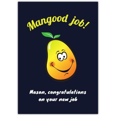 Funny New Job Congratulations Card with Mangood Job Pun and Smiling Mango Design
