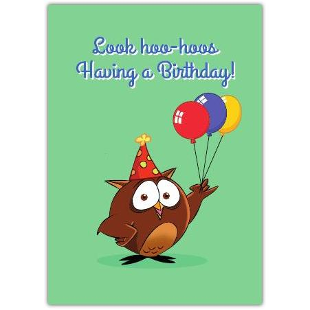 This delightful card features a charming cartoon owl wearing a festive party hat, holding colourful balloons against a fresh green background. The playful pun, "Look hoo-hoos Having a Birthday!" adds a touch of humour that's sure to bring a smile and a chuckle to the birthday celebrant.