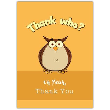 Express your gratitude with a touch of humour and charm using this delightful thank you card. Showcasing a quirky owl illustration with the cheeky phrase “Thank who? oh yeah, Thank You,” this card is sure to bring a smile to anyone’s face.