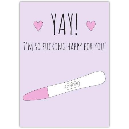 This fun and cheeky card features a bright pink pregnancy test illustration, surrounded by charming heart accents, perfectly capturing the joyous moment of expecting a new arrival. The playful "YAY! I’m so fucking happy for you!" message offers a refreshingly candid way to share your excitement and support.