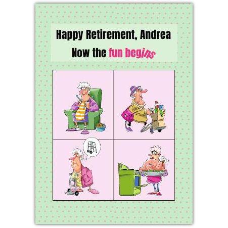 The soft green dotted background adds a cheerful and fresh feel, making it an ideal choice for a retirement celebration. The bold, personalised message on the front – "Happy Retirement, [Name] Now the fun begins" – can be customised with the recipient’s name, making it a truly unique and thoughtful keepsake.