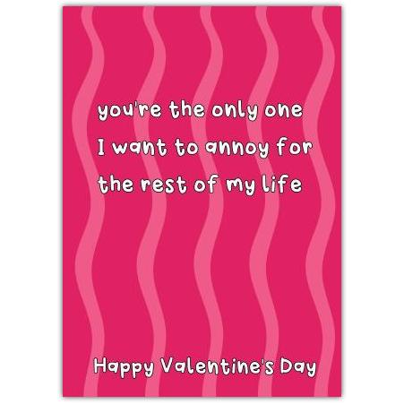 Share a laugh and a little love this Valentine’s Day with this playful and heartfelt card. Featuring a fun, cheeky message – "you're the only one I want to annoy for the rest of my life" – against a vibrant pink backdrop with wavy stripes, this card perfectly captures the humour and affection of a loving relationship.
