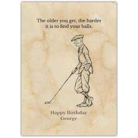 This witty birthday card features a clever and playful message alongside a classic illustration of a golfer, making it perfect for anyone with a sense of humour and a love for the game. The cheeky text, "The older you get, the harder it is to find your balls," is sure to bring a smile and laughter, making it an unforgettable birthday greeting.