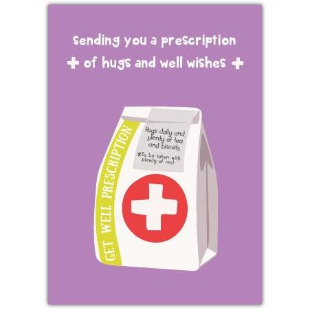 Send comfort and cheer with this heartfelt get well card, featuring a charming illustration of a medicine bag labeled "Get Well Prescription" and a playful message: "Sending you a prescription of hugs and well wishes." This thoughtful design is perfect for showing you care and lifting the spirits of anyone feeling under the weather.