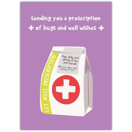 Send warmth and comfort with a smile using this delightful "Sending You a Prescription of Hugs and Well Wishes" get well soon card. Featuring a cute illustration of a medicine bag labelled with a playful prescription for "hugs daily and plenty of tea and biscuits," this card is a heartwarming way to lift spirits and share kindness.