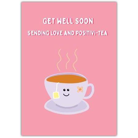 Featuring a cute, smiling cup of tea against a soft pink background, this card perfectly combines humour and heartfelt wishes with the playful pun "Sending love and positi-TEA". It’s an ideal way to brighten the day of anyone feeling under the weather and let them know you’re thinking of them.