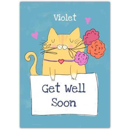 Brighten someone's day and bring a smile with this adorable "Get Well Soon" card featuring a charming yellow cat holding a bunch of colourful flowers. Set against a soothing blue background with sweet pink hearts, this cheerful design is perfect for sending warm wishes and encouragement to friends or family who are feeling under the weather.