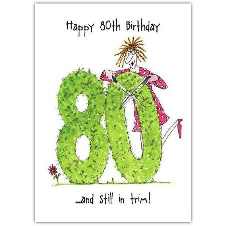 This delightful greeting card features a fun and quirky illustration of a lady trimming a large, leafy "80" shaped hedge, accompanied by the cheerful message: "Happy 80th Birthday... and still in trim!" It's the perfect way to recognise a special milestone with light-hearted charm.